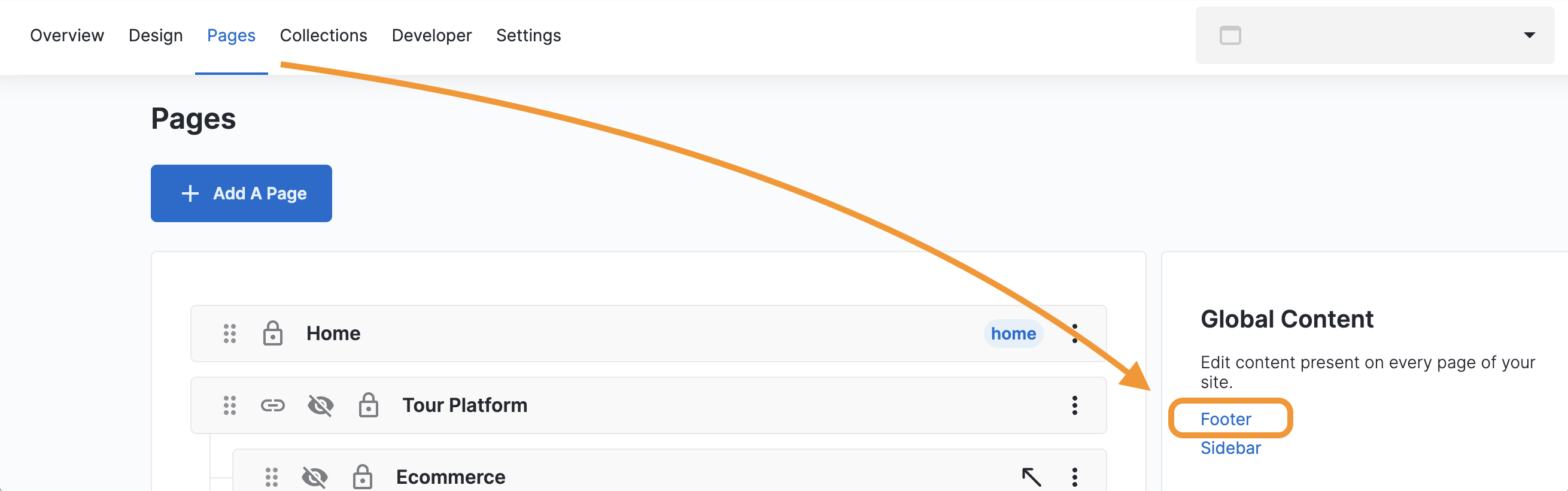 - On the right-hand side of the Pages panel, under the section labeled Global Content, select Footer.